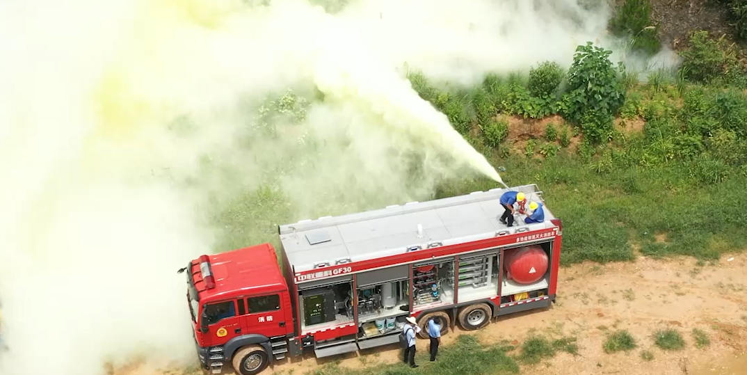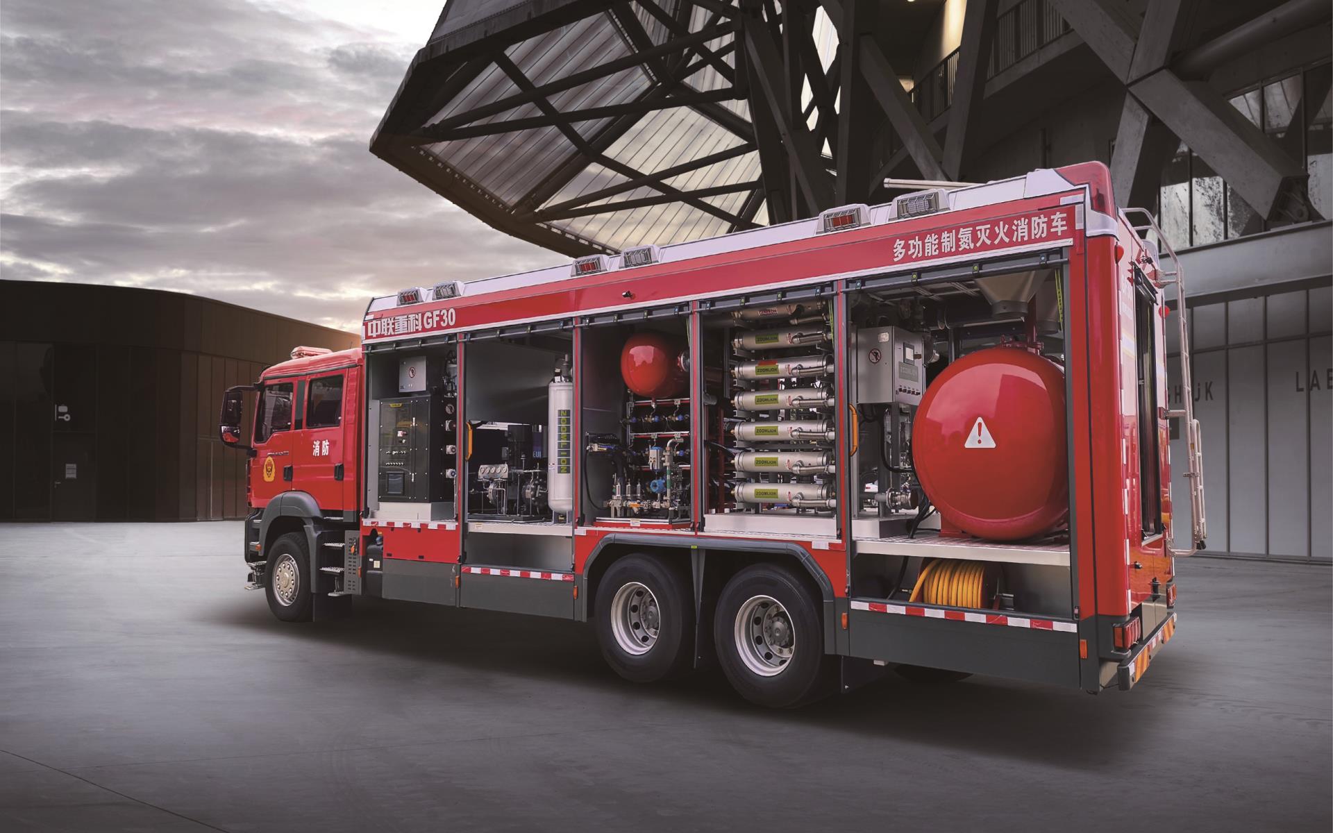 ▲中联重科“大流量持续制氮及粉剂复合喷射灭火装备”