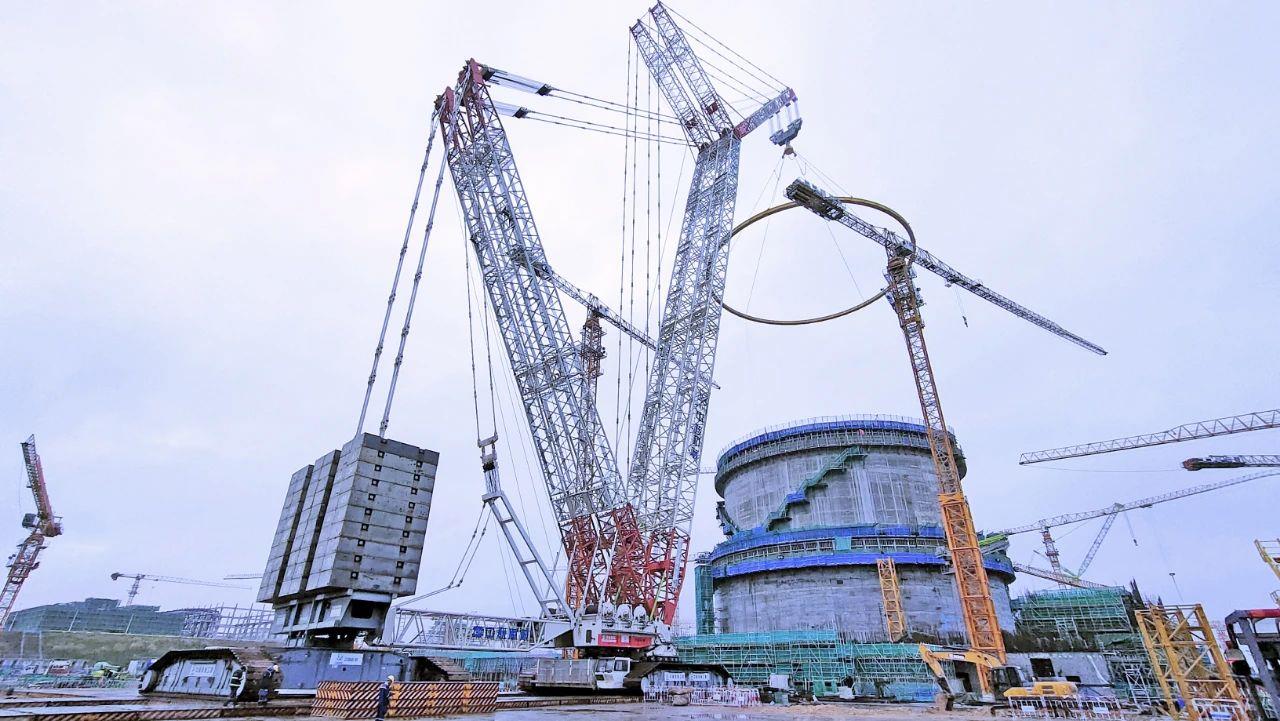 ▲中联重科3200吨履带吊正在进行环梁环轨吊装(图片来源于“华能昌江核电”公众号)