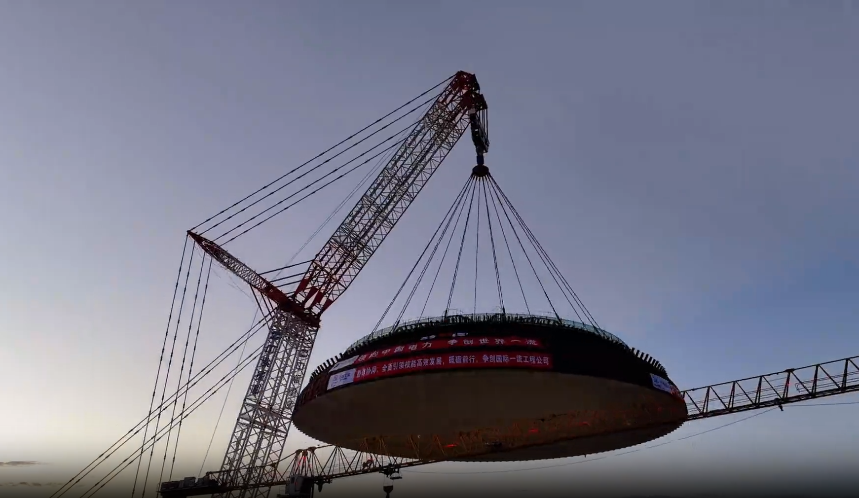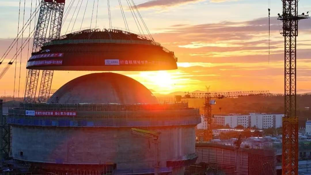 “准备起吊”,伴随着现场吊装总指挥的一声令下,10月18日 宅男视频,总重量约为600吨的昌江核电二期3号机组超大型外穹顶模块,在中联重科3200吨履带起重机的吊装下安全而平稳地落在核岛顶部,为核电机组勾勒出了雄伟的轮廓,也标志着核岛主体结构施工已基本完成,为接下来的安装调试及并网发电奠定了坚实的基础, 。