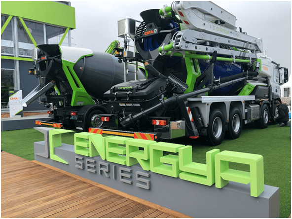 △中联重科CIFA产品 作为享誉全球的老牌混凝土机械制造商,中联重科意大利子公司CIFA展出了包括全球专利碳纤维臂架技术的泵车产品、ENERGYA系列的绿色混合动力搅拌车和搅拌布料泵车, 皆为CIFA本地化制造的明星产品,其中ENERGYA系列的MK28E搅拌布料泵车,为全球首台插入式混合动力搅拌布料泵车,采用行业前沿的电动和柴油混合动力技术,是积极践行行业可持续发展理念的标杆产品,受到展会现场观众的一致好评。
