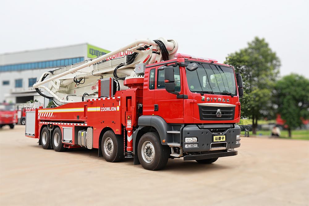 中联重科JP52型大跨距举高喷射消防车,结合国内外消防车的先进理念和消防实战创新设计而成,具备强大的灭火功能,整车性能优越,快速高效,操作性、安全性及智能化控制水平处于国际先进水平,是石油、石化、城市、库房等场所灭火的作战利器。