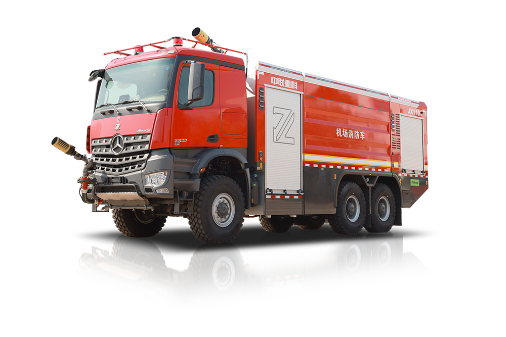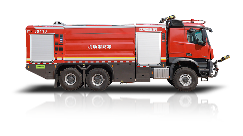 中联牌JX120A6型机场主力泡沫消防车,采用国际知名品牌奔驰6×6特种商用越野底盘改装,底盘动力强劲,搭载自动变速箱,加速快,车速高,救援更高效;消防水泵由独立专用大功率发动机驱动,行进中可随时开启消防系统灭火;配有大容量灭火剂罐,搭载智能灭火喷射系统,操作简单,在驾驶室内即可完成所有灭火救援操作,能快速扑救飞行器火灾,是各类机场必备的火灾救援主力装备。