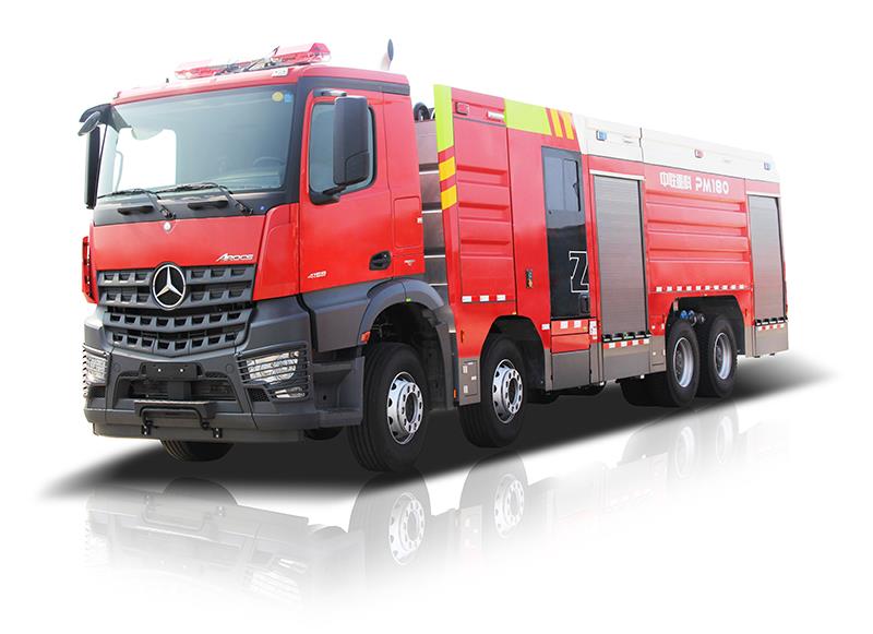 该车采用原装进口奔驰4158底盘,动力强劲,灭火剂装载量大,配置大流量进口消防泵、炮,适合扑灭一般固体类与液体类物质火灾或进行接力供水;设有全铝合金独立乘员室,可供7名消防员乘坐,并配有独立空调装置,内部空间宽敞明亮;此车消防作业系统可配置智能操作控制平台,能实现一键出水、出泡沫功能,人机交互界面友好,操作方便简洁;该车水路接口设计科学合理,贴近实战需求;整车外形简洁大气,可容纳多种灭火抢险救援器材、操作维护安全便捷,是城市公安消防部队和企业(石化,煤化,油库等)专职消防队的灭火利器