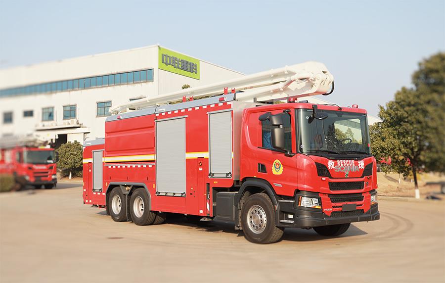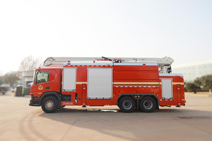 该车可全方位回转,各机构由液压驱动,操作简便灵活,消防实战灭火作业时展开迅速,运作平稳,安全可靠。本车带有水罐、消防泵,臂架顶端的消防炮射程远,流量大,可以在距火源较远的位置独立完成救火作业,是当今世界上较理想的高空消防灭火装备。