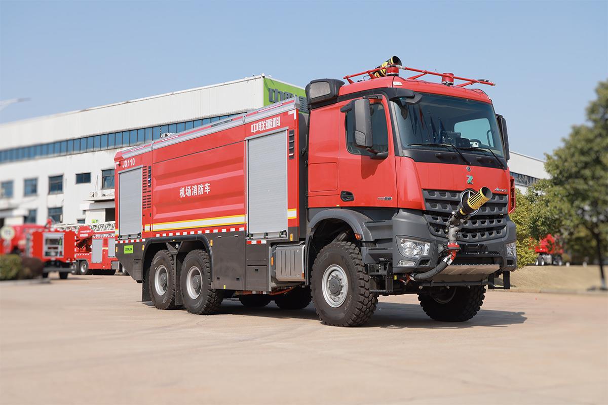中联牌JX120A6型机场主力泡沫消防车,采用国际知名品牌奔驰6×6特种商用越野底盘改装,底盘动力强劲,搭载自动变速箱,加速快,车速高,救援更高效;消防水泵由独立专用大功率发动机驱动,行进中可随时开启消防系统灭火;配有大容量灭火剂罐,搭载智能灭火喷射系统,操作简单,在驾驶室内即可完成所有灭火救援操作,能快速扑救飞行器火灾,是各类机场必备的火灾救援主力装备。