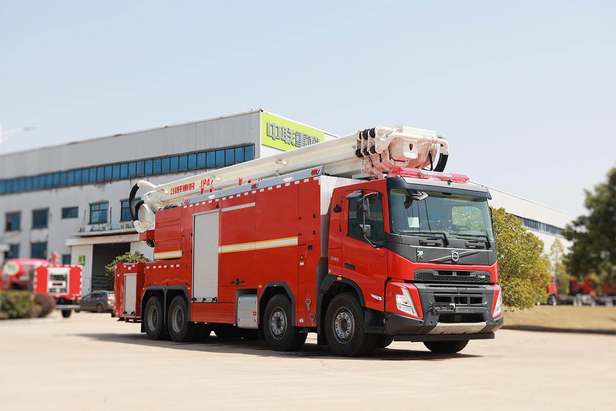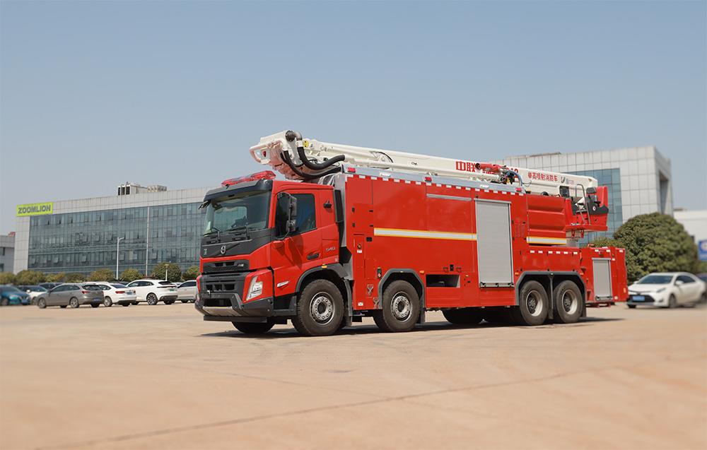 车辆采用沃尔沃FM540 84R B消防车专用底盘;配置4节伸缩臂+曲臂的臂架结构和H型活动支腿;配备包括万升级消防泵、4800L/min的三相射流消防炮,三相射流消防枪,双管电动卷盘,全自动泡沫系统、车载式干粉灭火系统等多种先进消防装备。适用于高层建筑、石油化工、港口和仓库的火灾扑救。